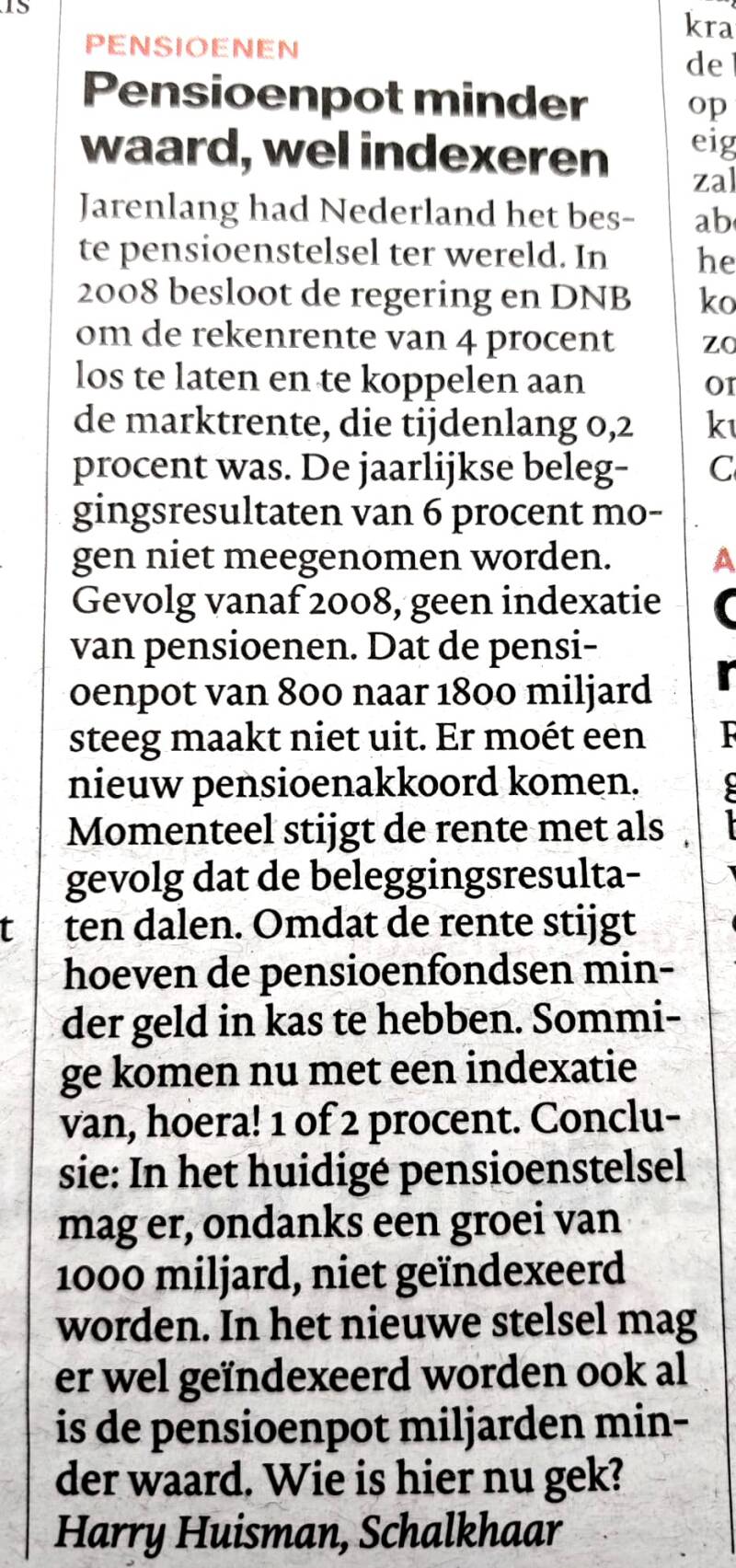 Pensioenwet moet wijken (telegraaf 1-11-2022)
